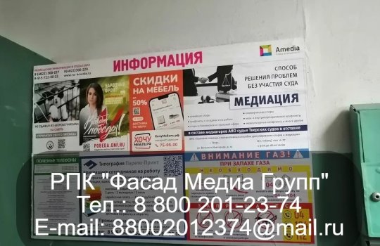 РПК «Фасад Медиа Групп» напечатала и разместила рекламные листовки на стендах, установленных в подъездах многоквартирных домов. Период размещения рекламы – 15 дней. Охвачены различные районы города