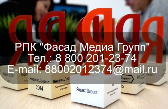 РПК «Фасад Медиа Групп» настроило рекламу нашему заказчику в сети Интернет. Рекламная кампания проводится посредством размещения ссылки на сайт рекламодателя в Яндекс.Директе. Период рекламной кампании составляет 1 мес. Для получения услуг по размещению рекламы в Интернете обращайтесь в наше рекламное агентство. Будем рады сотрудничеству
